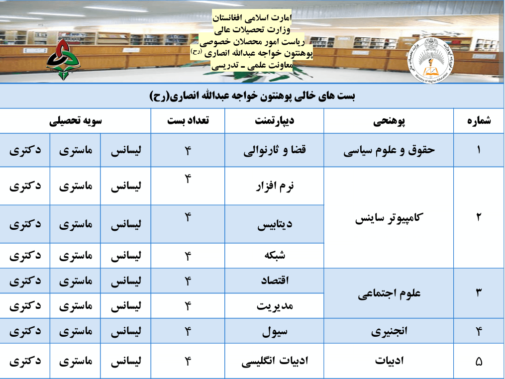 پوهنتون خواجه عبدالله انصاری(رح) برای تکمیل کادر علمی خود، تعداد (34) بست علمی را (برای سومین بار) به صورت دایمی اعلام میکند.
